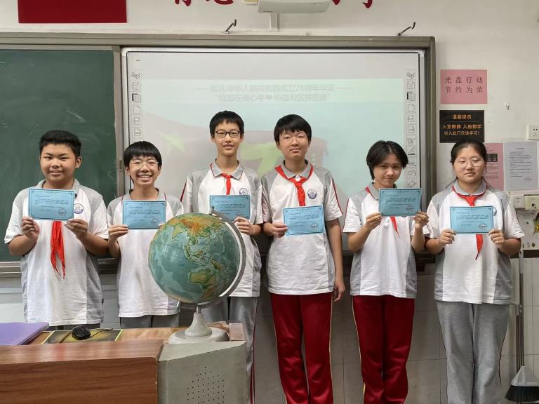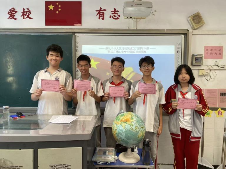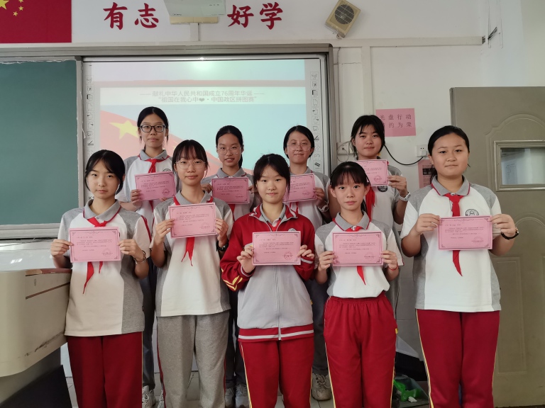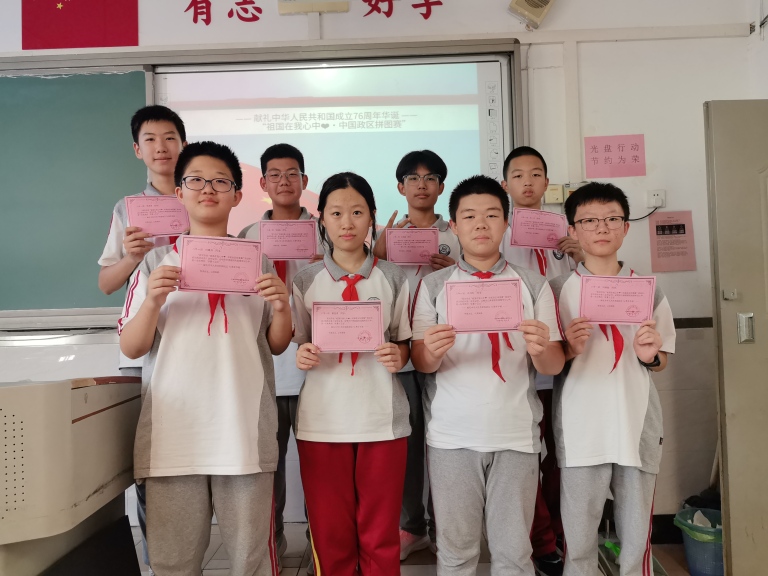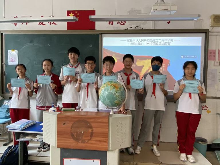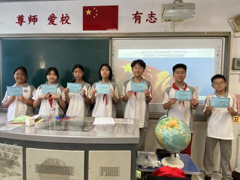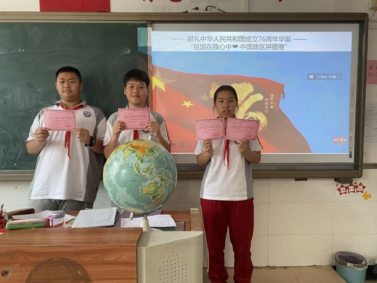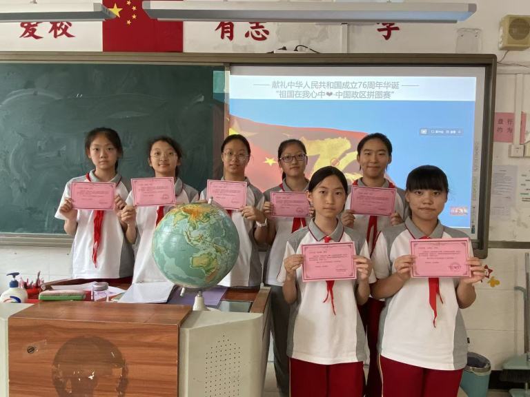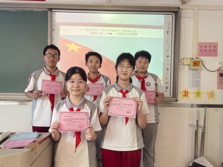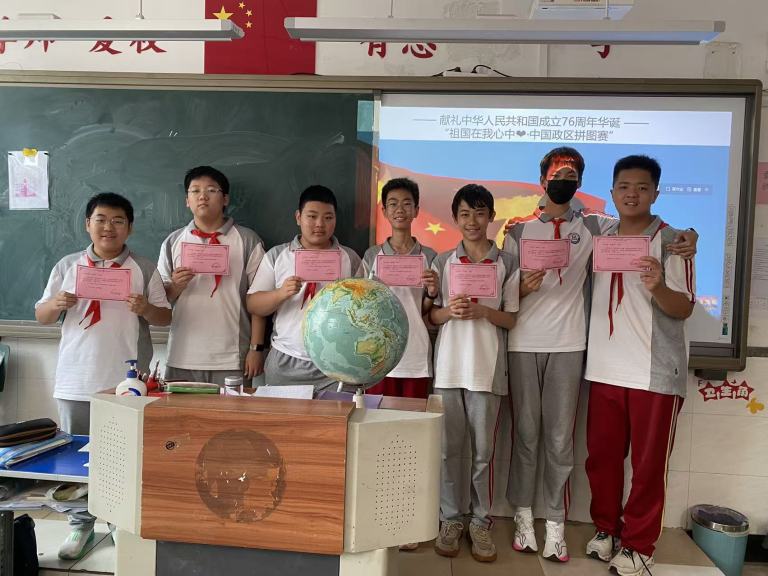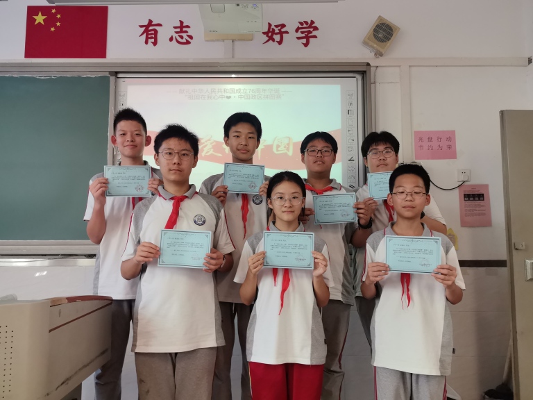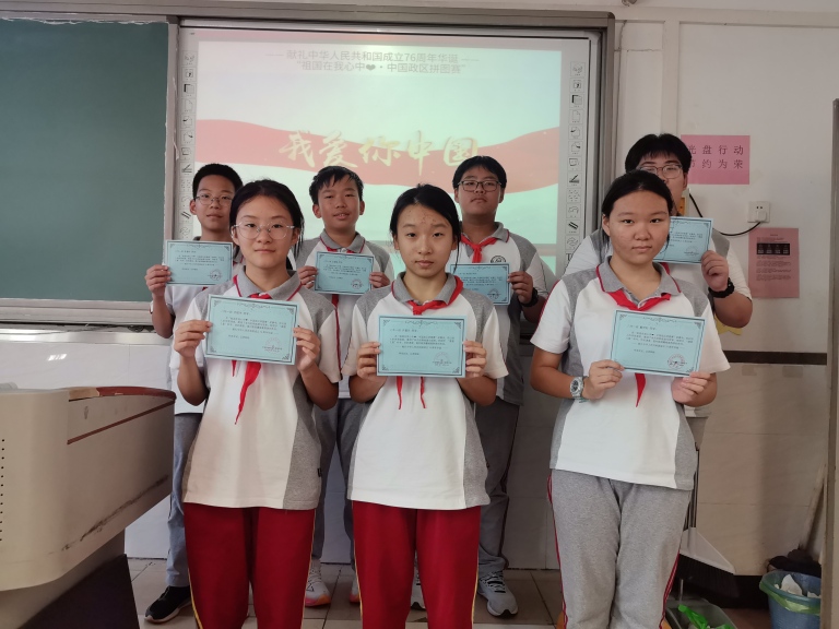 针对八年级学生,学校创新开展了“献礼中华人民共和国成立76周年华诞——祖国在我心中 中国政区拼图赛”,将活动与地理学科学习深度融合。比赛中,同学们熟练拼接中国政区图,快速识别各省区名称、位置、轮廓、简称与行政中心,在竞技中强化国土意识,加深对“祖国疆域”的认知,实现知识学习与爱国教育的有机统一。