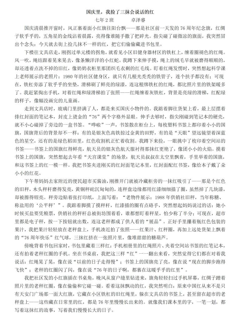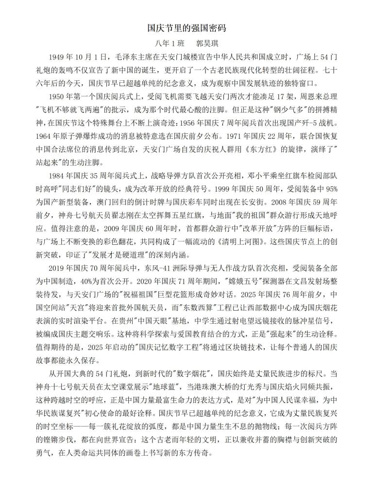 为庆祝中华人民共和国成立76周年,进一步厚植学生的家国情怀,我校精心策划并开展了“厚植家国情怀 共庆祖国华诞”系列主题活动。通过多形式、多维度的活动设计,让爱国主义精神在校园落地生根。