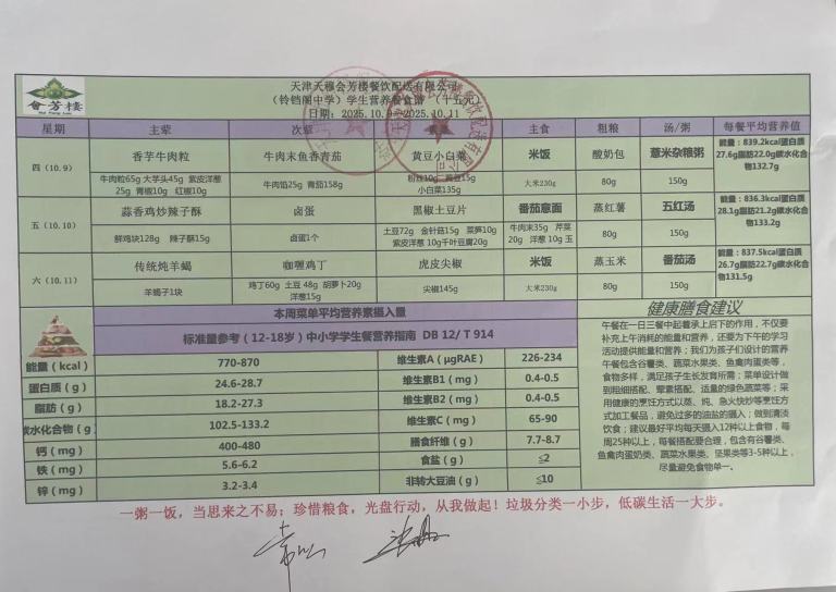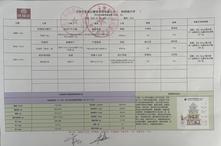 天津市铃铛阁外国语中学2025年10月9日~10月11日(清真餐、汉民餐)菜谱