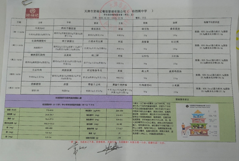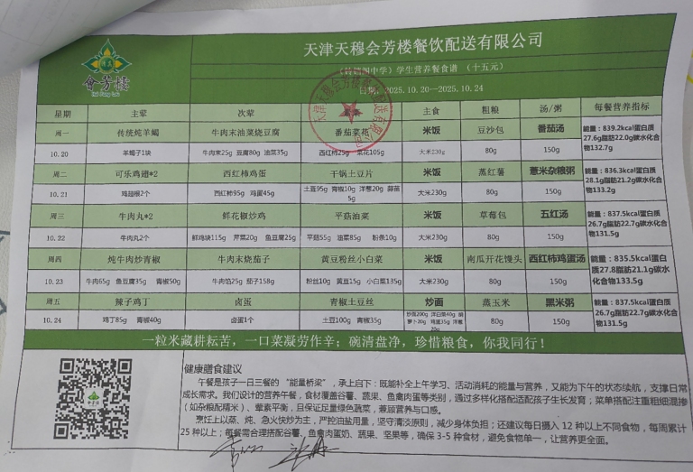 天津市铃铛阁外国语中学2025年10月20日~10月24日(清真餐、汉民餐)菜谱