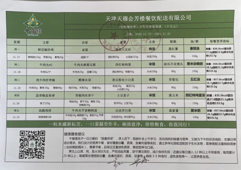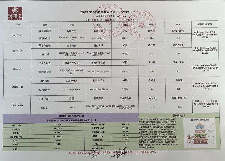 天津市铃铛阁外国语中学2025年11月17日~11月21日(汉餐、非汉餐)菜谱