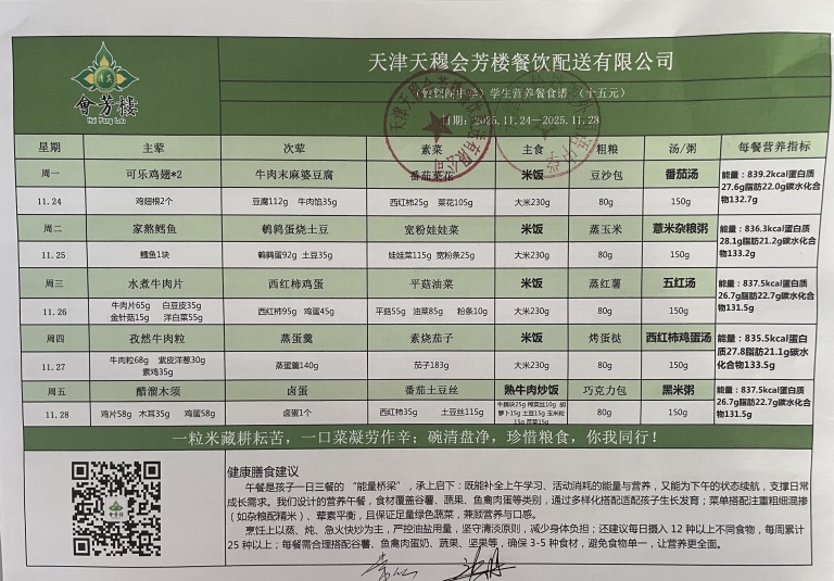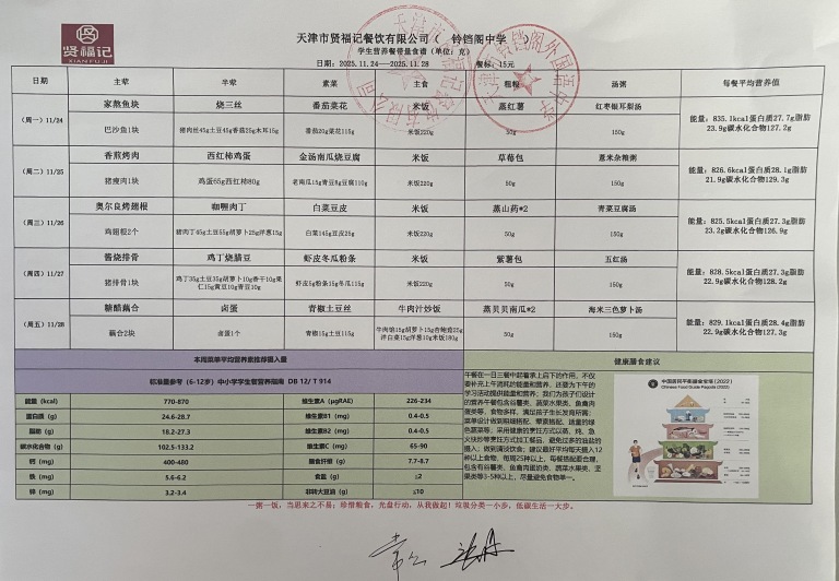 天津市铃铛阁外国语中学2025年11月24日~11月28日(汉餐、非汉餐)菜谱