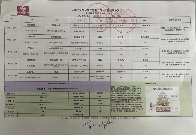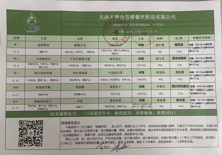 天津市铃铛阁外国语中学2025年12月8日~12月12日(汉餐、非汉餐)菜谱