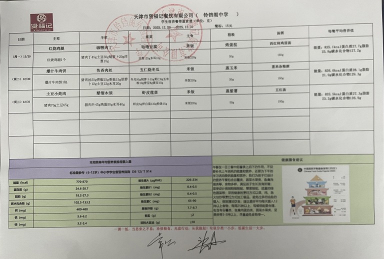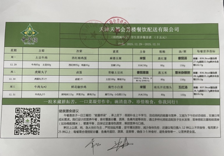 天津市铃铛阁外国语中学2025年12月29日~12月31日(汉餐、非汉餐)菜谱