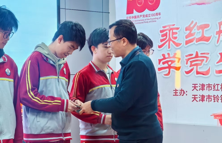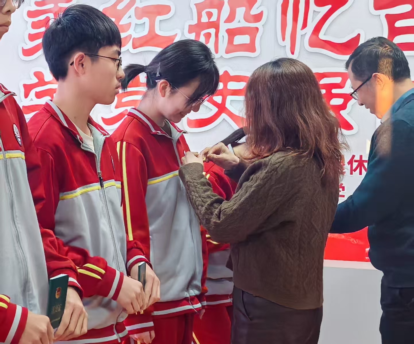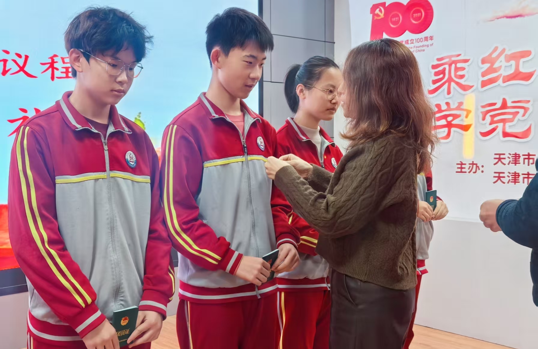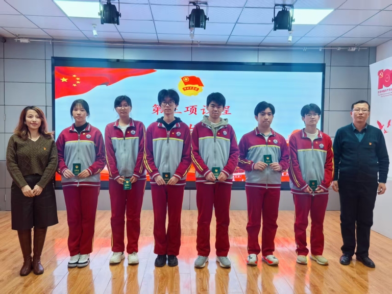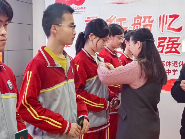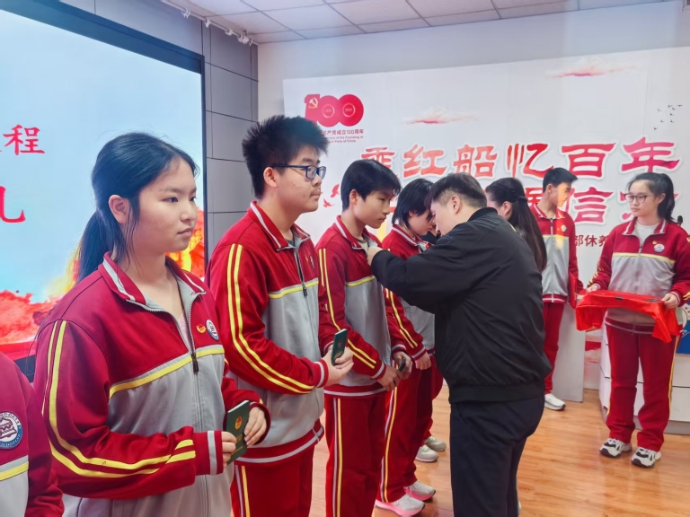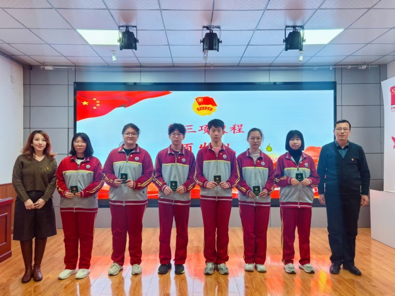 在热烈的掌声中,学校领导为新团员逐一佩戴上闪耀的团徽、颁发团员证。闪亮的团徽不仅是共青团员身份的象征,更意味着一份沉甸甸的责任与担当。