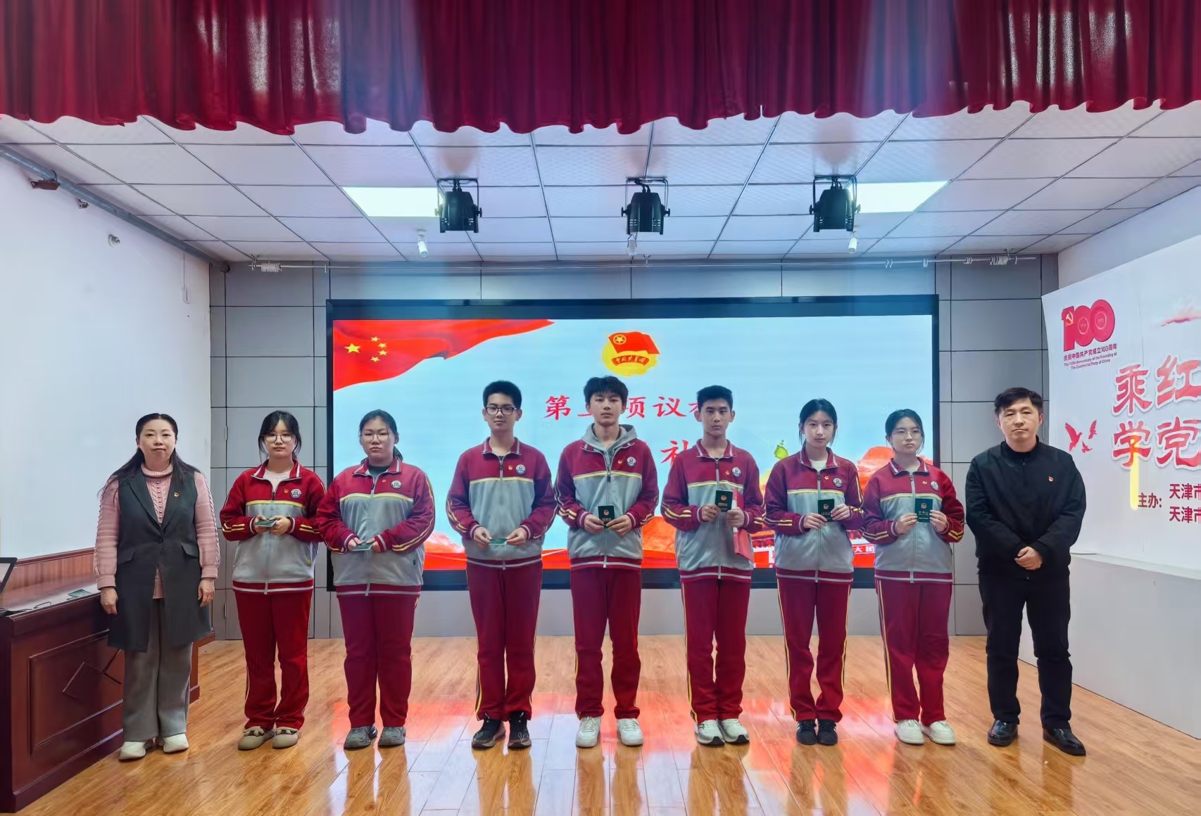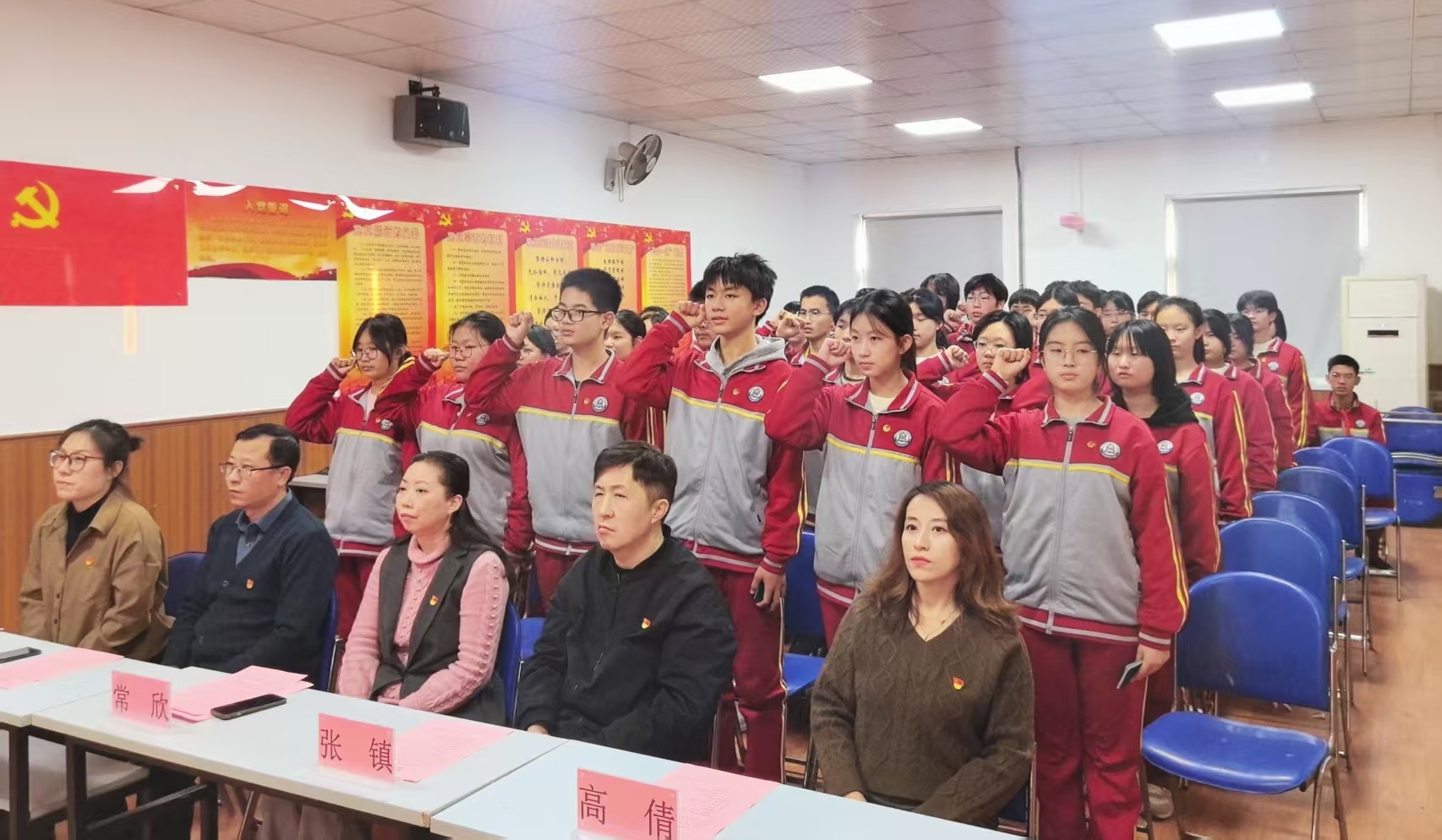 学校党委书记、少工委主任常欣,党委副书记、校长张镇,少工委副主任、德育副校长王冬,九年级年级组长、党员代表高倩,团委副书记、大队辅导员李爽出席活动,与新发展团员、优秀团员代表及八年级团校学员共同见证了这一光荣时刻。