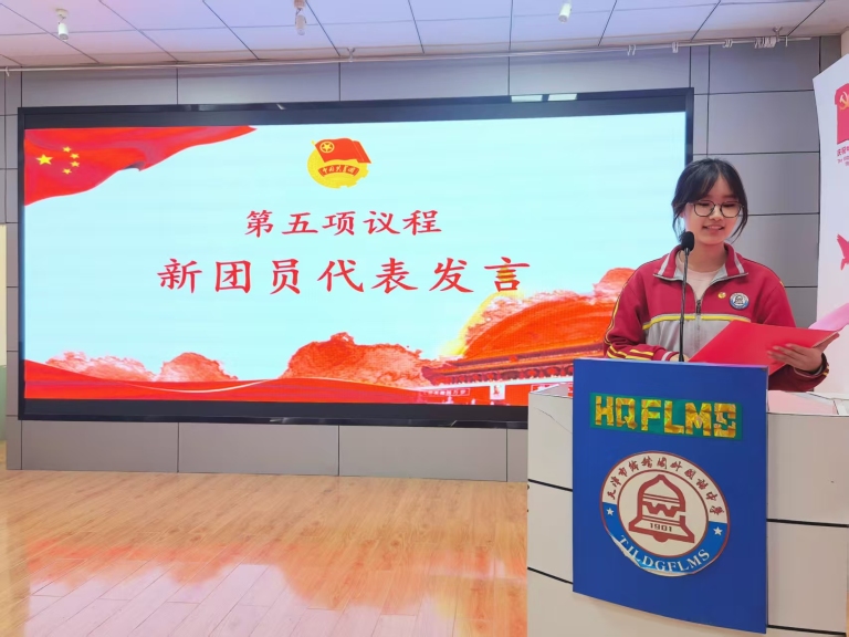 新团员代表2023级1班团支部团员惠欣雨怀着加入团组织的激动与自豪,承诺将以此为新的起点,以团员标准严格要求自己,勤奋学习、锤炼品德,发挥模范带头作用,将个人理想融入国家和民族事业,用实际行动践行入团誓词。