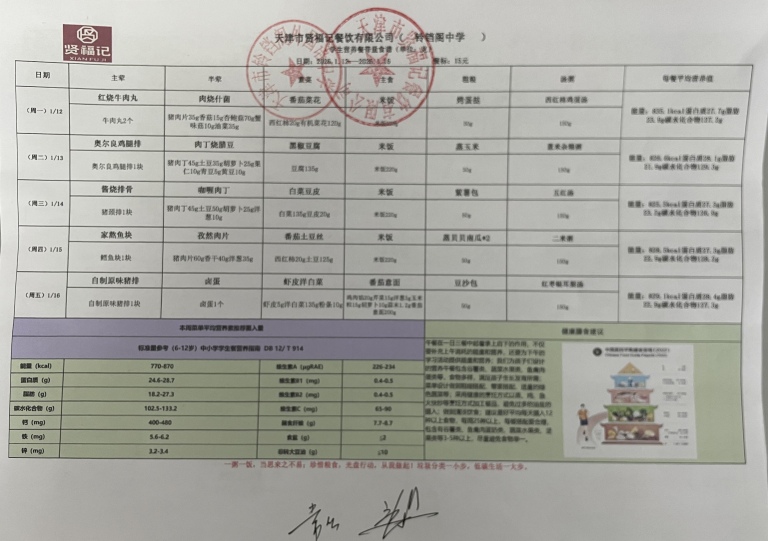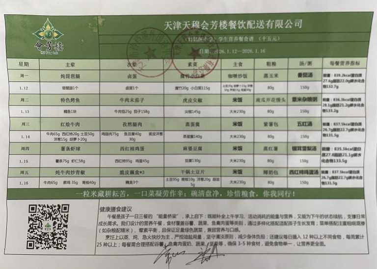 天津市铃铛阁外国语中学2026年1月12日~1月16日(汉餐、非汉餐)菜谱