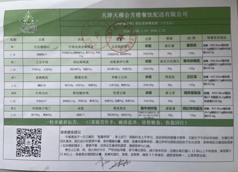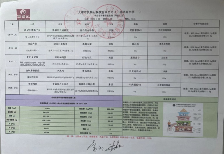 天津市铃铛阁外国语中学2026年1月19日~1月23日(汉餐、非汉餐)菜谱