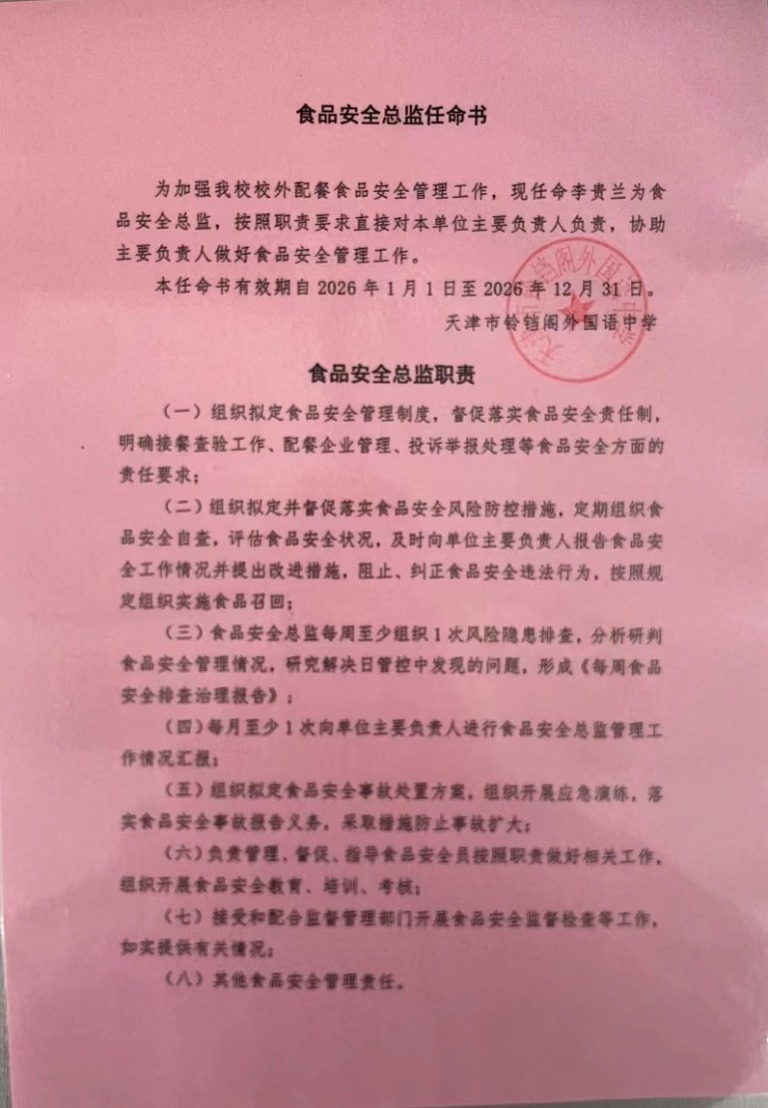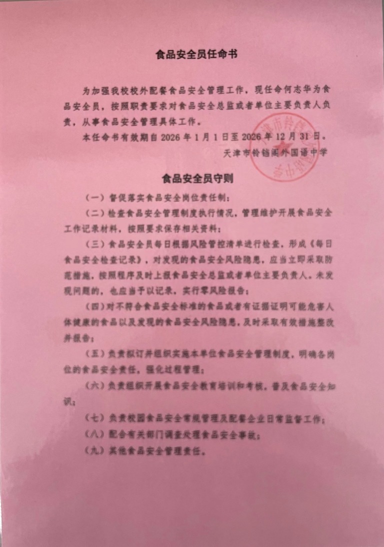 2025-2026(一)天津市铃铛阁外国语中学学生食品安全信息公示(食品安全总监、食品安全员更新)