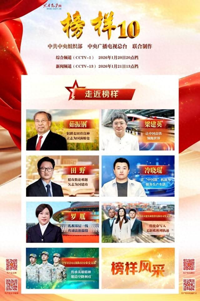 为深入学习贯彻习近平新时代中国特色社会主义思想,学习贯彻党的二十大和二十届历次全会精神,教育引导广大党员干部学习榜样、争当先进,在推进中国式现代化中奋勇争先、建功立业,中央组织部、中央广播电视总台联合制作了《榜样10》专题节目。