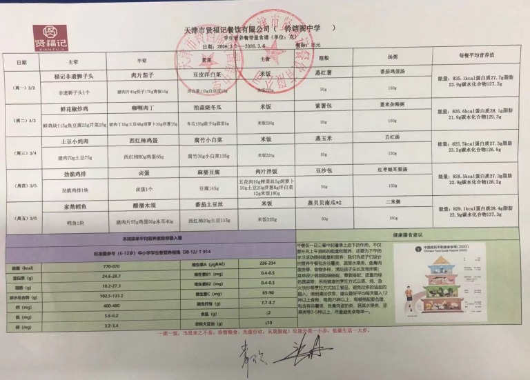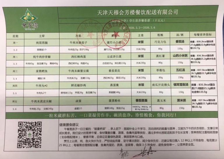 天津市铃铛阁外国语中学2026年3月2日~3月6日(汉餐、非汉餐)菜谱