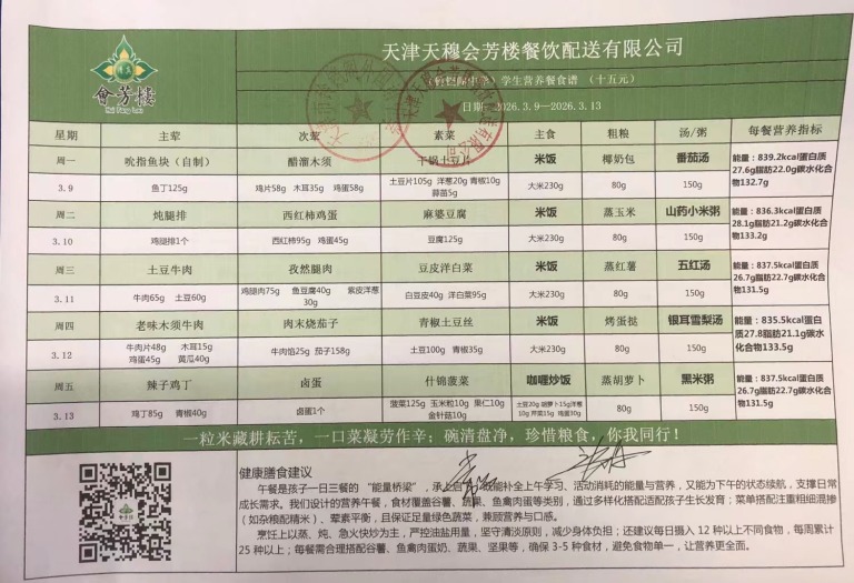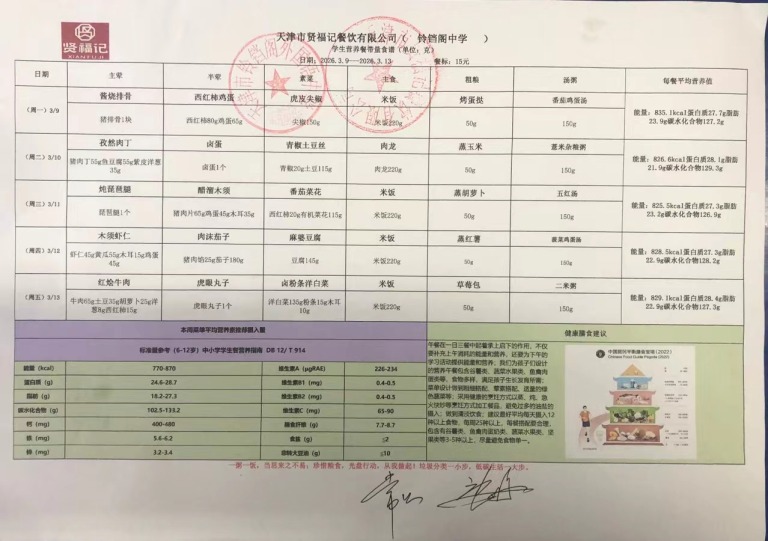 天津市铃铛阁外国语中学2026年3月9日~3月13日(汉餐、非汉餐)菜谱